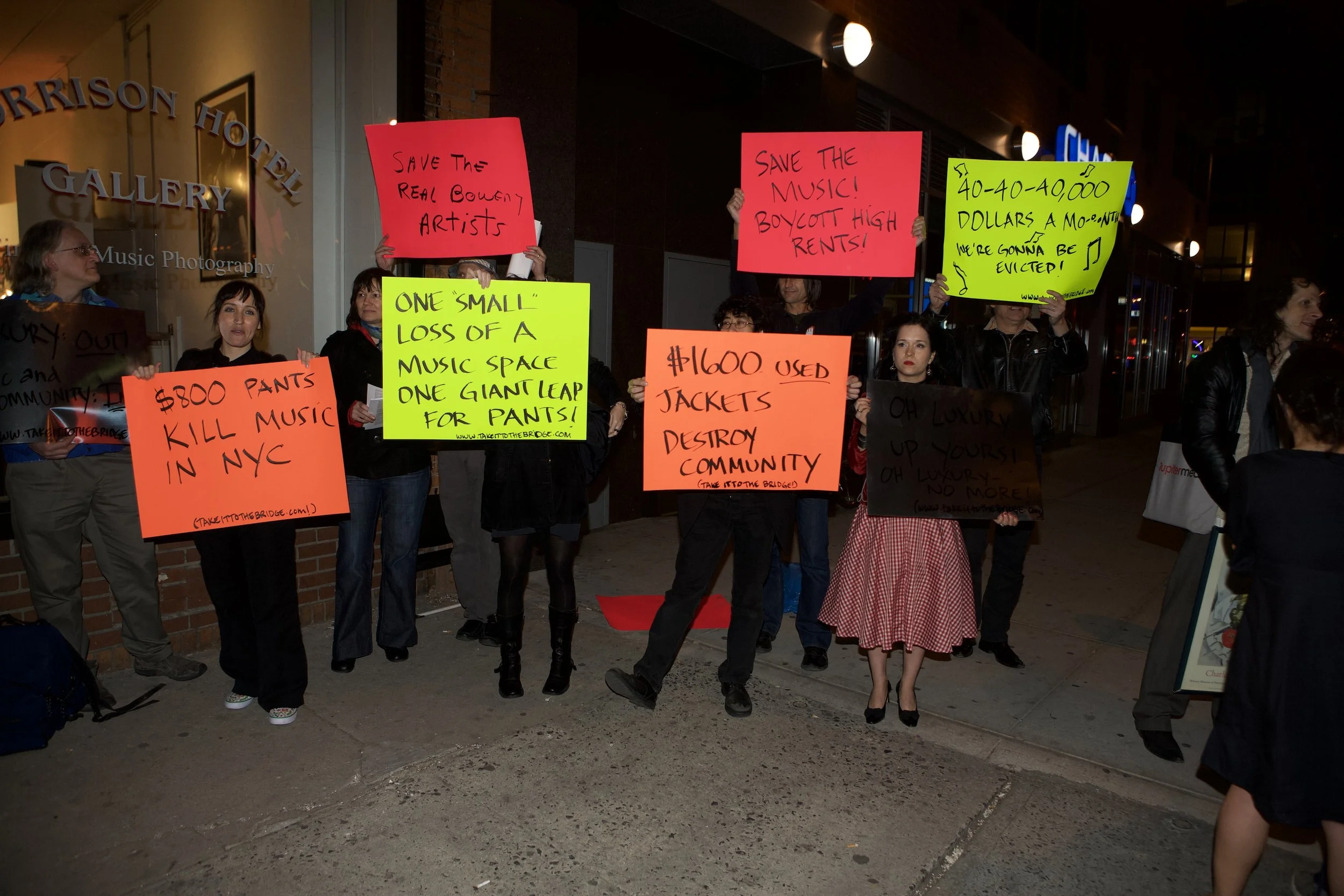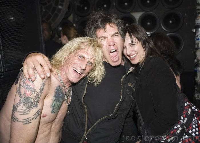 Clockwise: Dick Manitoba (The Dictators), Protestors on the sidewalk of nearby Morrisson Hotel Gallery, Party Guests outside of the new store, Jimmy Webb with Clem Burke (Blondie) and friend, Joan Jett (Joan Jett & The Blackhearts)